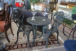 Size: 24 Diameter 27H Color/Mat'l/Artist: "Aged Cast Iron with floral pattern, 2 chairs and 1 Table" |