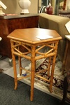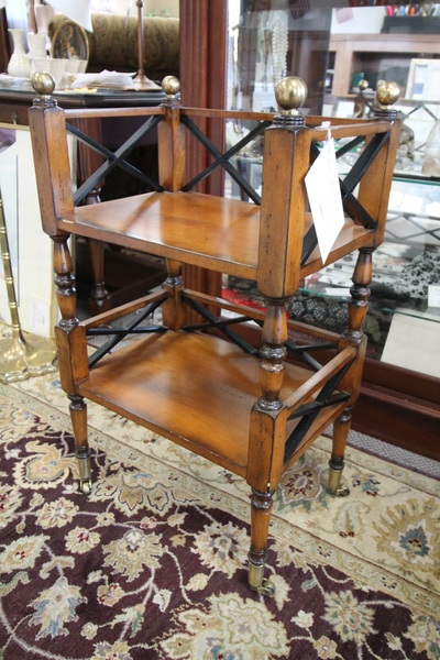 | "Lovely unique side table has a leatherette top accent, lid on the side that has 2 metal cannisters underneath. " |