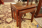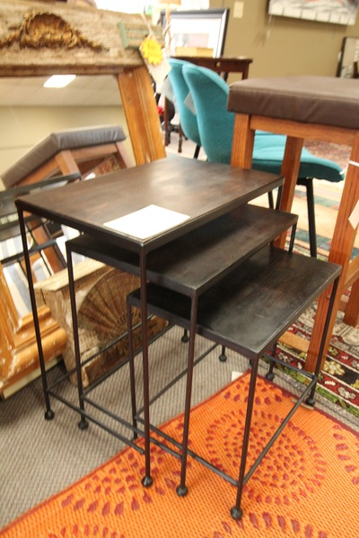 Size: 21W 13D 24H Color/Mat'l/Artist: "Rustic Dark Wood, Metal Legs, 3 piece nesting table" |