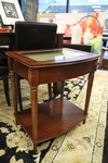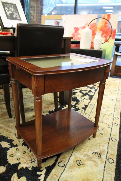 Size: 23W 18D 26H Color/Mat'l/Artist: "Wood with Glass Inlaid Top, Tapered Leg, Cherry Finish" |