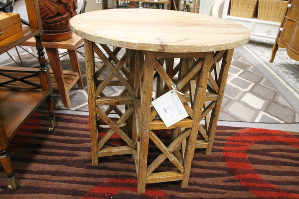 Size: 18W 18D 13H Color/Mat'l/Artist: "Rustic, Natural Wood with Mother of Pearl Inlaid Design, Foldable Table" |