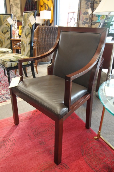 Size: 25W 20D 38H Color/Mat'l/Artist: "Wood Frame, Chocolate Brown Leather, Holland Company" |