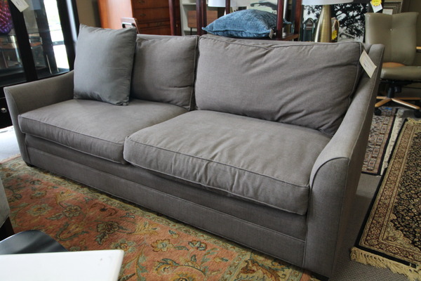 Size: 95.5L 36D 36H Color/Mat'l/Artist: "Gray Canvas Style Fabric with Nailhead Trim, Turned Legs with casters" |
