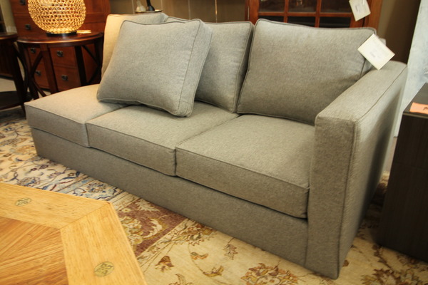 Size: 52W 30D 19H Color/Mat'l/Artist: "Microsuede Light Gray Blue Upholstery, Tapered Legs" |