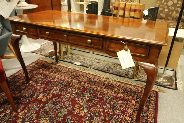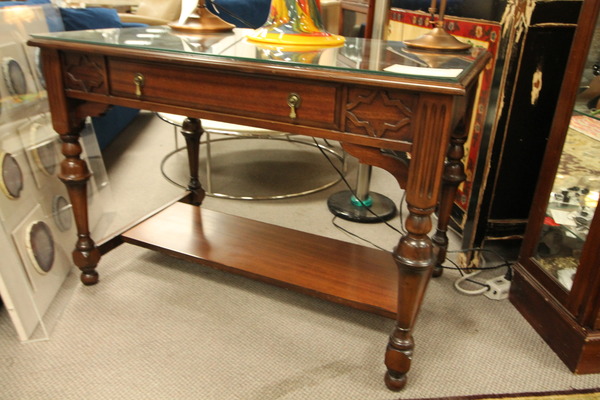 Size: 66.5L 34D 30.5H Color/Mat'l/Artist: "Cherry Wood, Glass Top Protection, Antique Brass Handles" |