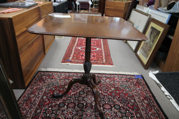 Size: 24 Diameter 28H Color/Mat'l/Artist: "Mahogany Wood, Glass Protected, Reeded Base, Queen Anne Legs" |