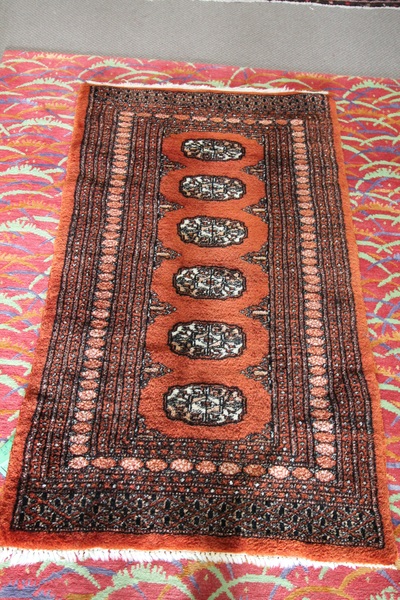 Size: 2ft-8in W 4ft-8in L Color/Mat'l/Artist: "Deep Rust Color, Wool, Tribal Pattern" |